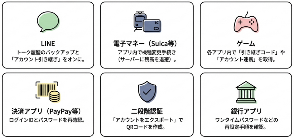 データ移行が完了しても、まだ終わりではありません。LINEや電子マネーなど、個別に設定が必要なアプリがあります。ここを忘れると「LINEが使えない」「Suicaの残高が消えた」といったトラブルになるので、必ず確認しましょう。