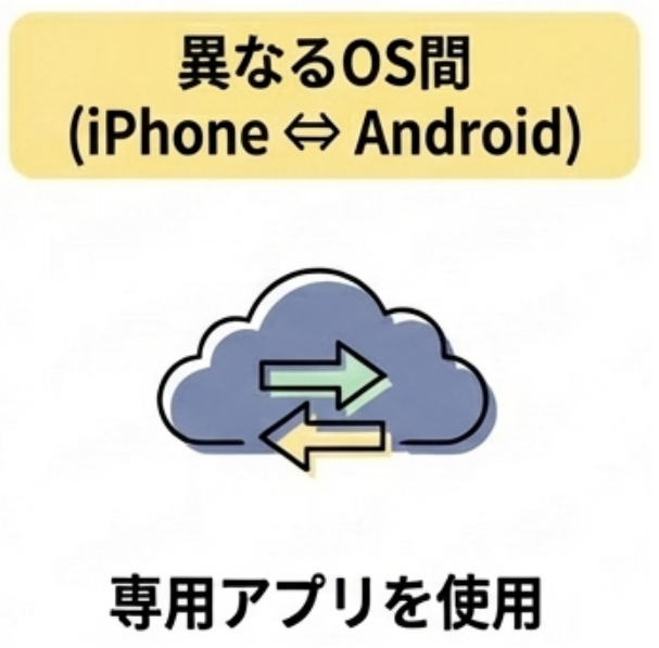 異なるOS間の移行は少し手間がかかります。iPhoneとAndroidではデータの管理方法が異なるため、同じOS同士のようにワンタッチで移行することはできません。ただし、連絡先や写真などの基本的なデータは、以下の方法で移行できます。