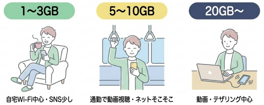 - 1〜3GB:自宅にWi-Fiがあり、外出先ではメールやSNSを少し見る程度の方